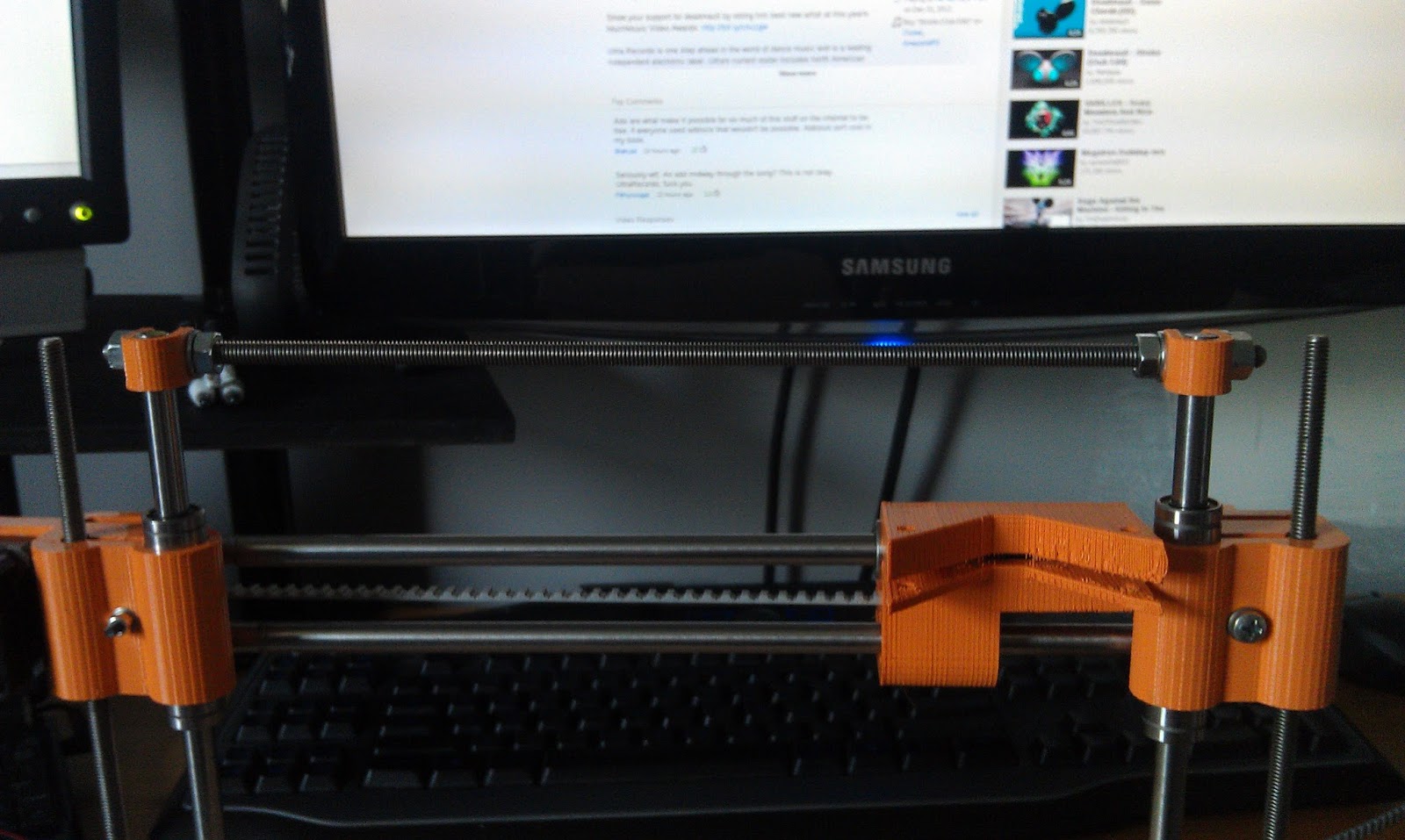 I spent most of the first third of my Winter break off from University hacking on the printrbot design posted by whosawhatsis. I wanted to make a few optimizations and most importantly separate the parameterizations of the smooth and threaded rod. Unfortunately, I altered a bit too much in the script to merge easily. Lesson learned, make small alterations and make commits frequently. No big deal, since he seems to still be actively developing it. Otherwise, I am mostly done with the mechanical assembly. I just need to figure out a solution for bowden extrusion. Link to the wiki page is here.